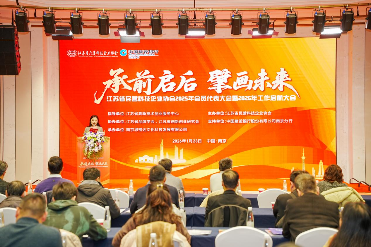 1月23日下午,在辞旧迎新之际,由江苏省高新技术创业服务中心指导,江苏省民营科技企业协会主办,江苏省品牌学会、江苏省创新创业研究会共同协办,南京思密达文化科技发展有限公司承办的“江苏省民营科技企业协会2025年会员代表大会暨2026年工作启航大会”在南京金陵虹桥饭店隆重举行,来自全省的民营科技企业代表、行业专家等齐聚一堂,共同见证这场年度峰会的召开。大会由中国建设银行南京分行大力支持。从年度报告到会员选举,从专家演讲到标准发布,这场大会藏着2026年江苏民营科技的发展密码!