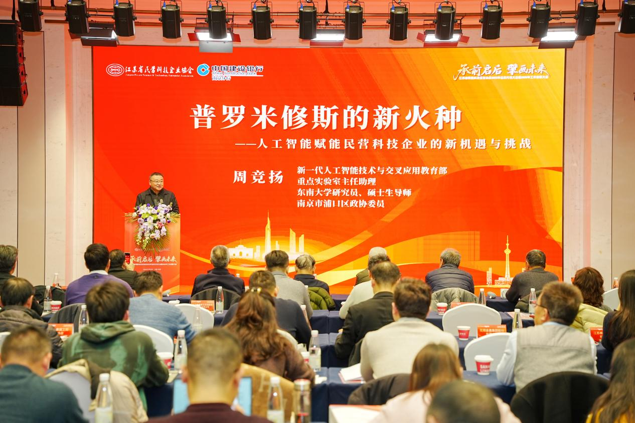 新一代人工智能技术与交叉应用教育部重点实验室主任助理、东南大学硕士生导师、南京市浦口区政协委员周竞扬研究员带来《普罗米修斯的新火种——人工智能赋能民营科技企业的新机遇与挑战》主题分享,现场金句频出,他首先从一个企业人工智能使用情况的小问卷切入,引出了点石成金的AI发展历程,深入浅出地讲述了人工智能的核心技术与前沿应用,结合实际案例,分析了AI在制造业质检优化、生产流程升级等实际场景的应用成效,并建议科技型企业应聚焦细分应用场景,通过轻量化AI部署实现降本增效,为企业降本增效提供实操路径。